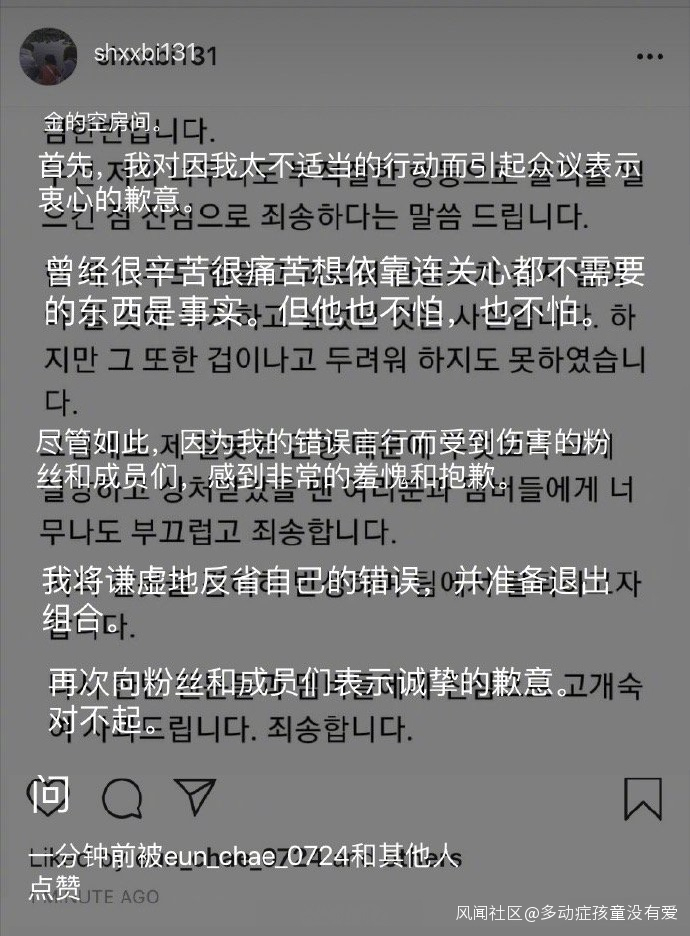 首先因為我的不恰當的行動而引起爭議真心覺得抱歉,一段時間因為太痛苦和難受而想依賴不應該關心的東西,**這是事實,但那也因為害怕而沒能做。**即便如此面對因為我的錯誤言行而比什麼都失望和受傷害的各位粉絲和成員真是覺得慚愧和對不起大家,虛心反省我的錯誤,並從團隊裏退出。再一次跟粉絲和成員們低頭道歉。