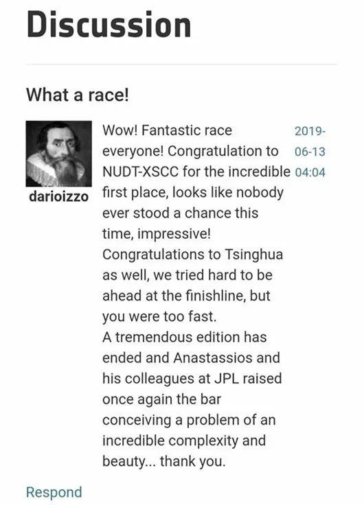 (內容翻譯如下:wow,精彩的比賽!向不可思議的第一名NUDT-XSCC隊伍致敬,這一次他們的優異表現讓其他隊伍根本毫無機會,讓人印象深刻。同樣祝賀清華大學,我們的隊伍在比賽末段非常盡力追趕,但你們實在是太快了。我們剛剛完成了非常精彩的一個<軟件>版本,Anastassios和他在JPL的同事再次在這個集複雜和美學於一體的問題上更上一層樓,謝謝你們。)