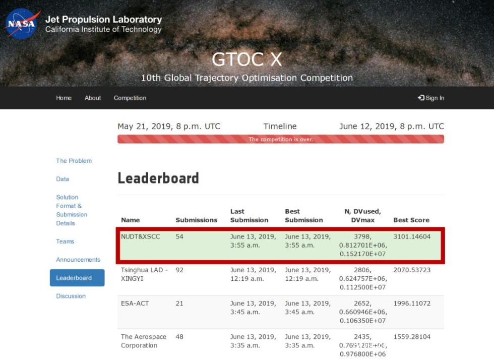 時間倒回到當天凌晨3:55分,距比賽結束僅有五分鐘,由國防科大空天科學學院羅亞中教授帶領的國防科技大學與西安衞星測控中心聯隊(NUDT&XSCC)提交了最終結果——3101分,以絕對的優勢摘得桂冠!