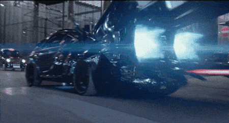 只要按下,車子輪胎收縮、外殼重組,碩大的推進器噴射出藍色火焰!