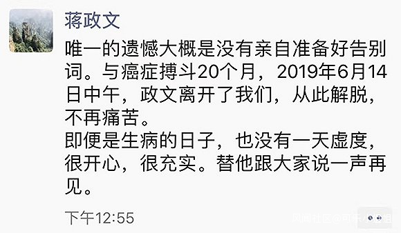 蔣政文的最後一條朋友圈(親人代表)詳細描述了他與癌症搏鬥的心態。