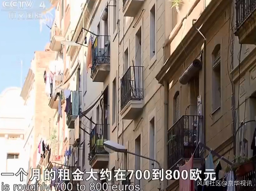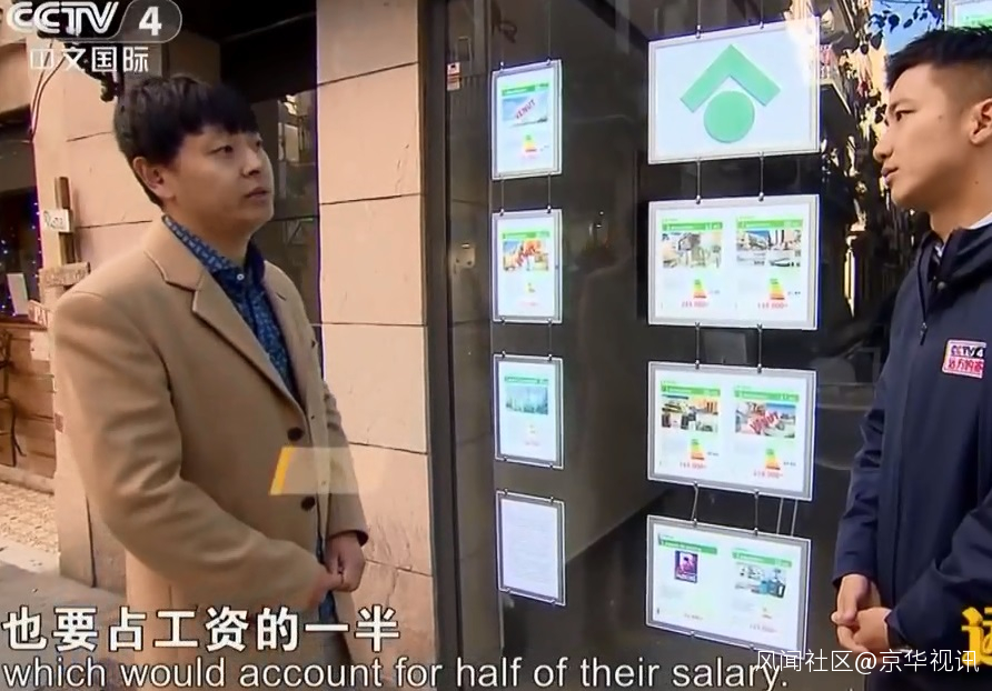 節目採訪一個在西班牙巴塞羅那水產公司工作的留學生,他租住的小區一居室只有20多平米,見不到陽光,不算什麼好户型。每月租金要大概700-800歐元。這個價格約佔剛工作年輕人收入的一半(見下面,有圖有真相)。