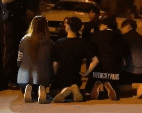 畫面是幾名中國留學生,正跪地向警察認錯,態度謙卑,嘴裏念着:“Yes,Sir.”