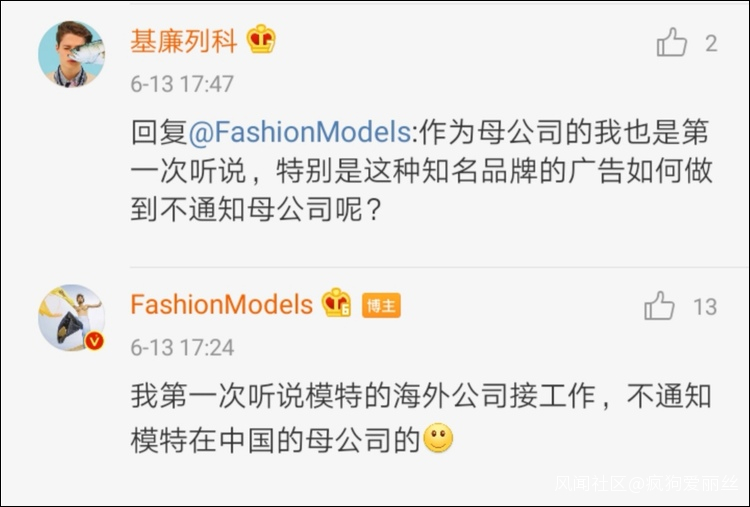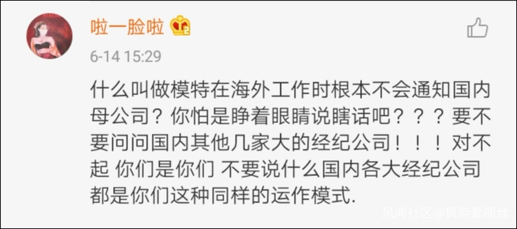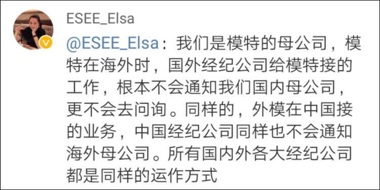 評論區中,有自稱是模特母公司的工作人員回應稱,這份工作是模特海外經紀公司給接的工作,不會通知國內母公司。