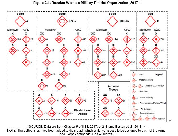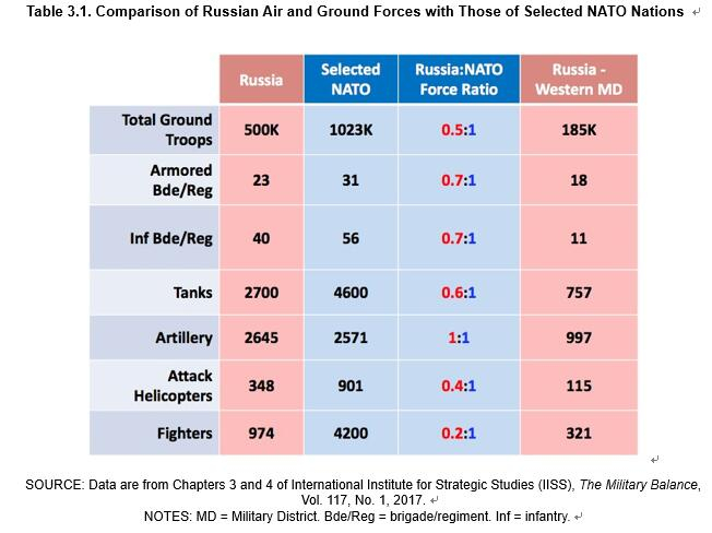 表格3.1的最右一列是蘭德公司對俄羅斯西部軍區的評估,該軍區能動用十八萬五千的地面部隊(包括陸軍、空降、特種、海軍步兵,以及炮兵和後勤部隊)擁有757輛坦克,接近1000門火炮和115架攻擊直升機,可以得到300架戰鬥機,以及139架遠程轟炸機的支援。此外,俄羅斯這一方向部署有第六、第一近衞坦克軍和第20近衞集團軍,此外還有總部設在加里寧格勒的第11軍。