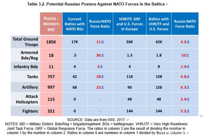 可以用於對抗這些部隊的,北約目前在波羅的海方向的態勢處於嚴重劣勢。如表格3.2所示,波羅的海三國的軍力加在一起相當於4個美國式的步兵旅,只有少量牽引式火炮支援。他們沒有坦克(除了一些老舊的坦克,主要用於訓練),極少的現代化步兵戰車,沒有戰鬥機。目前有3個多國混合戰鬥羣為他們提供支援:其中一個由英國主導, 一個加拿大,一個德國。這些戰鬥羣合在一起也只有3700人,42輛坦克,6門自行火炮。