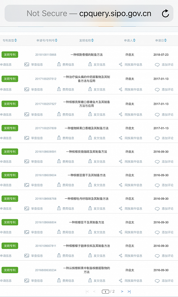 不過查詢國家知識產權局專利檢索系統,尚未發現名為“今珠多糖注射液”的相關專利,而許啓太名下目前擁有的專利大多與檳榔有關,涉及檳酚香煙、無毒咀嚼檳榔、檳榔豆乾、檳榔口香糖、檳榔炭燒咖啡、檳榔可樂等。目前許啓泰名下的幾家公司也都是與檳榔產業相關。