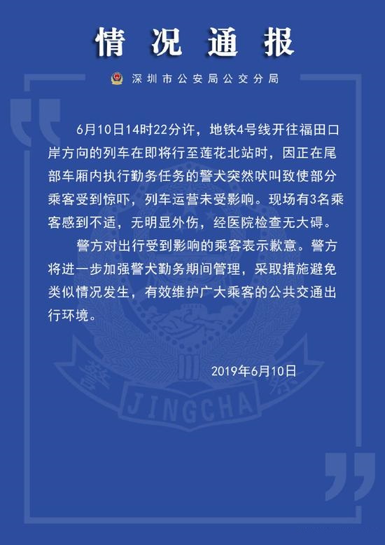 深圳公交公安發佈情況通報,6月10日14時22分許,地鐵4號線開往福田口岸方向的列車在即將行至蓮花北站時,**因正在尾部車廂內執行勤務任務的警犬突然吠叫,致使部分乘客受到驚嚇,**列車運營未受影響。現場有3名乘客感到不適,無明顯外傷,經醫院檢查無大礙。