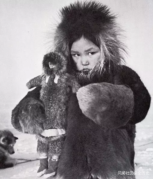 一個身穿稀有皮草抱着玩偶的因紐特小女孩