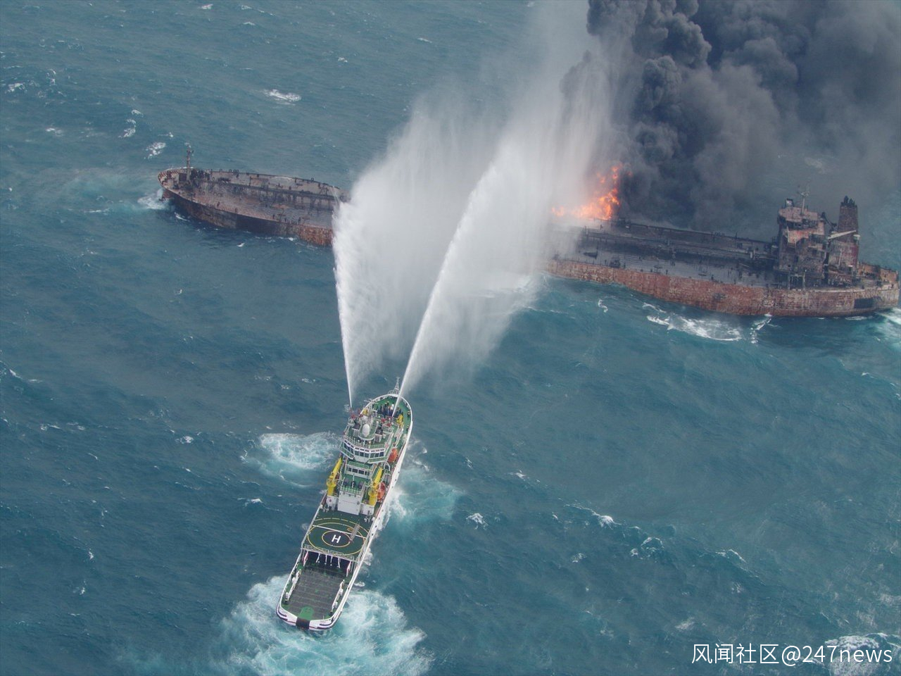 伊朗桑吉號油輪與其他船相撞後起火燃燒,圖為救援船隻灑水救火畫面。 來源網絡