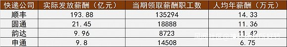 實際上,一組人均年薪酬的數據,更加能表明目前快遞公司們人工成本的增加。