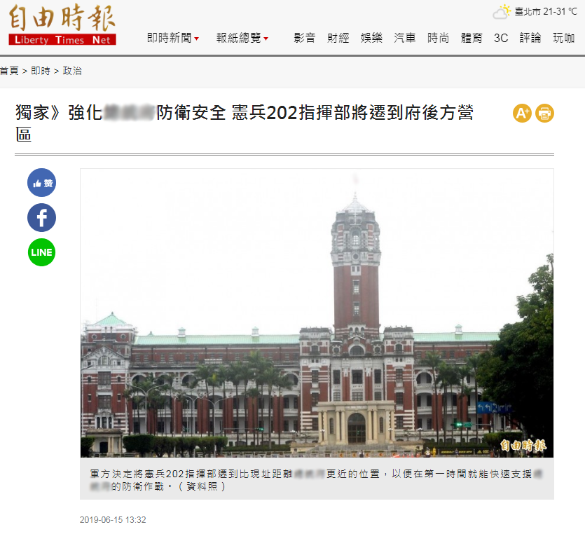 據台灣綠媒《自由時報》15日報道,台“憲兵”202指揮部目前是與台北“憲兵”隊合署辦公,位在台北市中華路、長沙街、延平南路交口。台軍方高層官員今天(15)稱,台防務部門日前已與台北市政府進行研議,202指揮部將連同台北“憲兵”隊,一起搬到距離“總統府”僅有一路之隔的貴陽營區。