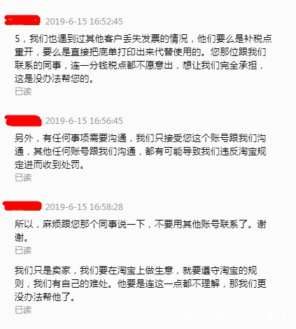 “倉庫賬號”看到照片,不再懷疑我們是否真的開了票。但是仍然説自己沒有收到,並且要求我們:把原發票掛失,給他重新開一份,税點(約100元)由我們賣家全部承擔。他的理由是,如果不這樣做,他們公司追究起來的話,他要承擔相應損失。