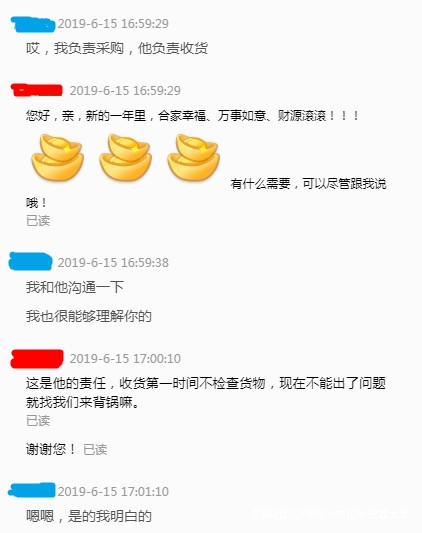 詳情:雖然拉黑了對方“倉庫賬號”,但是在我們店裏下單的那個“採購賬號”的旺旺還是可以正常聊天的。於是,我專門給“採購賬號”發了幾條信息,解釋了一下我們的做法、原因及苦衷。對方表示理解。