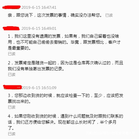6月14日,買家一直跟我聯繫的“採購賬號”(我之所以這麼叫,是為了和下文將要出現的“倉庫賬號”做區分),告訴我説貨物包裹裏面沒有收到發票,問我是不是另外寄的,或者是不是沒開。此時,距離客户收到貨(5月25號),已經差不多3個星期了。