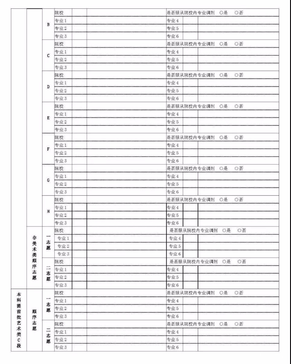B段:美術類和非美術類,其中美術類為平行志願,可以填報8所平行志願高校;非美術類設置2個順序志願,每個志願填報1所高校。