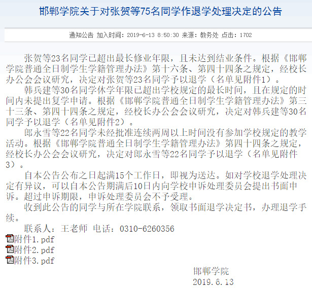 這份發佈於6月13日的公告顯示,依據《邯鄲學院普通全日制學生學籍管理辦法》(以下簡稱《辦法》),經校長辦公會會議研究,決定對張賀等23名學生予以退學,他們超出了最長修業年限,且未達到結業條件;韓兵建等30名學生因休學年限超出學校規定的最長時間,且在規定的時間內未提出復學申請而被退學;郎永雪等22名學生退學原因,是因在未經學校批准的情況下,連續兩週以上時間沒有參加學校規定的教學活動。