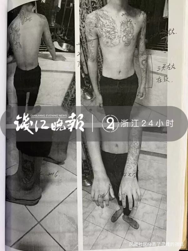 江山市人民法院一位法官介紹,此時濤濤身上諸如龍,麒麟鬼面等各種圖案文身已經佔據上半身一半左右的面積。