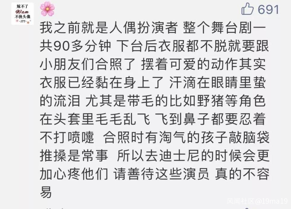 一位人偶扮演者表示,扮演者艱辛難以想象,希望大家善待演員。