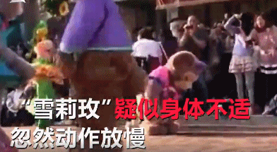 之前在香港迪士尼一場演出時,玫玫的扮演者跳着跳着,身體忽然不舒服,動作慢了下來,身體向前傾,最後跪在了地上。