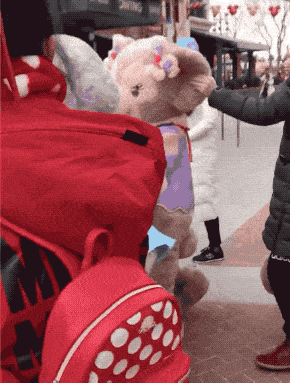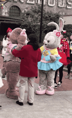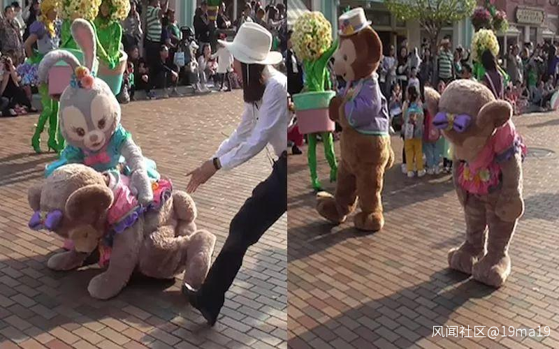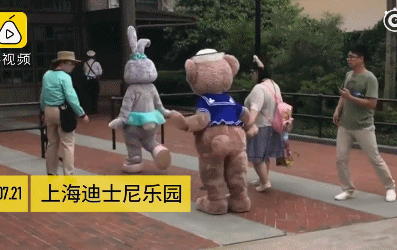 去年上海迪士尼,可愛的“雪莉玫”小熊玩偶正在和遊客扭屁股互動,旁邊忽然竄出一個男的上去就拍了玫玫後腦勺一巴掌。