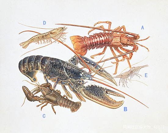 沒錯,圖中C就是蝲蛄,但A和B一大一小那倆看起來像小龍蝦的,卻都不是小龍蝦!他們分別是:A龍蝦和B海鰲蝦。(PS:D看起來像是某種對蝦,E看起來像北極蝦或鷹爪蝦——鷹爪蝦很可能是38元大蝦事件的主角,在青島當地被俗稱為“立蝦”,著名的嶗山沙子口金鈎海米即是用這種蝦晾曬製成)。