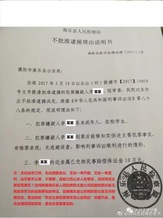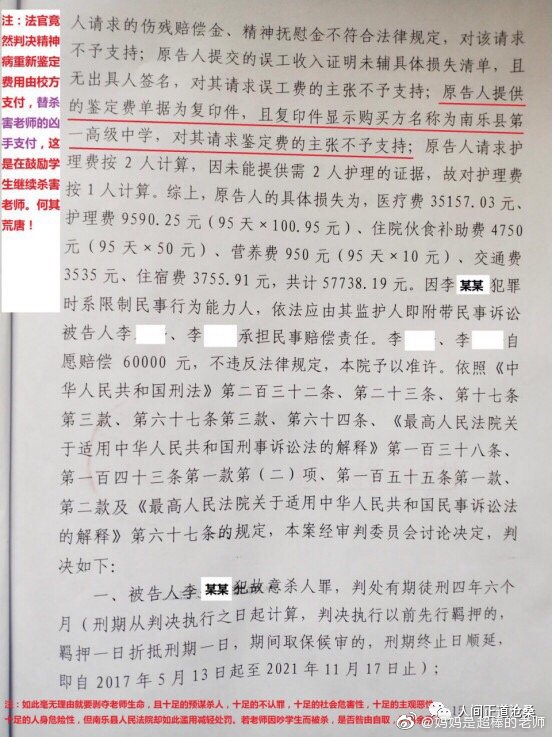 判決書歪曲事實、玩弄法律、耍文字遊戲,南樂縣人民法院這種不負責任、違法的判決,實質是對廣大老師生命的漠視,是對學生殺害老師罪惡行徑的鼓勵。南樂縣人民法院這種踐踏公平正義的審判,是法律的恥辱!是廣大老師的恥辱!該案件中老師無任何過錯,且兇手不認罪,尚如此濫用減輕處罰違法進行判決。那麼請問法官們:若老師因愛之深責之切吵學生被殺,是否咎由自取、死有餘辜?為了公平正義,為了普天下老師不再無端遭受殺害,我誓將維權到底!正義的法律必將戰勝一切破壞法制的司法人員!