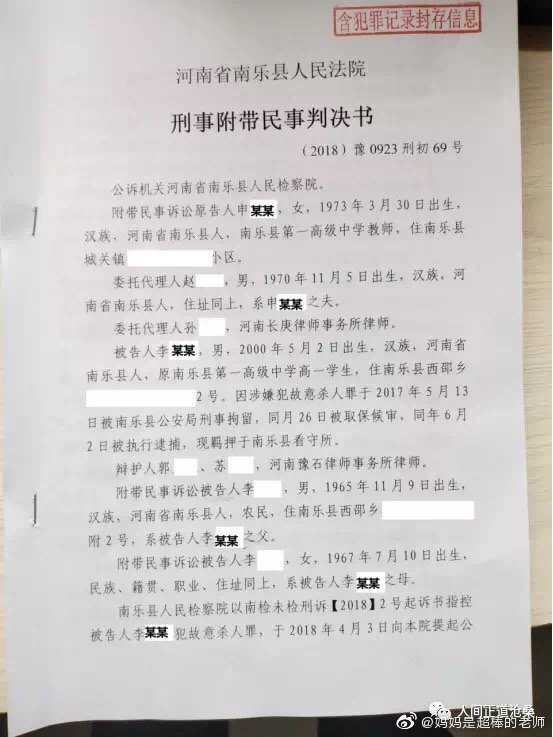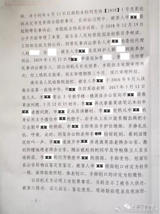 河南南樂一中老師遭割喉,嫌犯學生被判刑4年6月_風聞