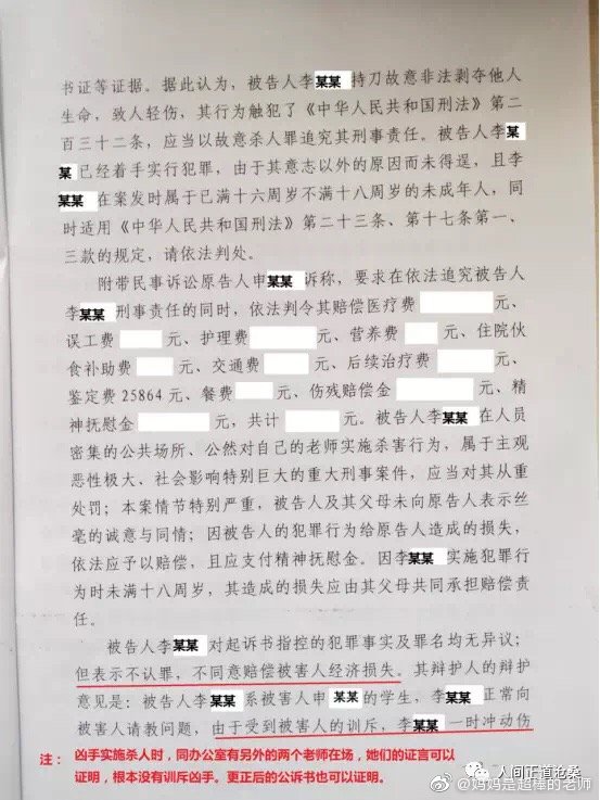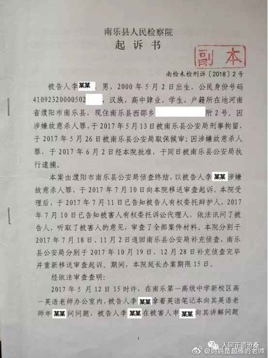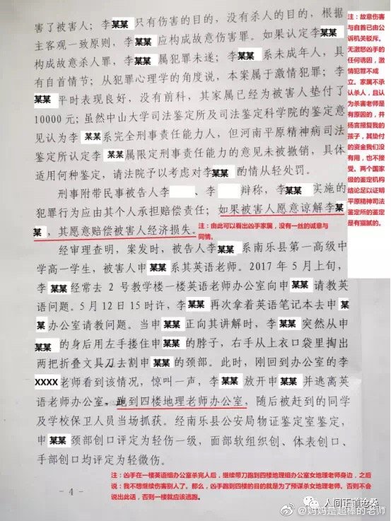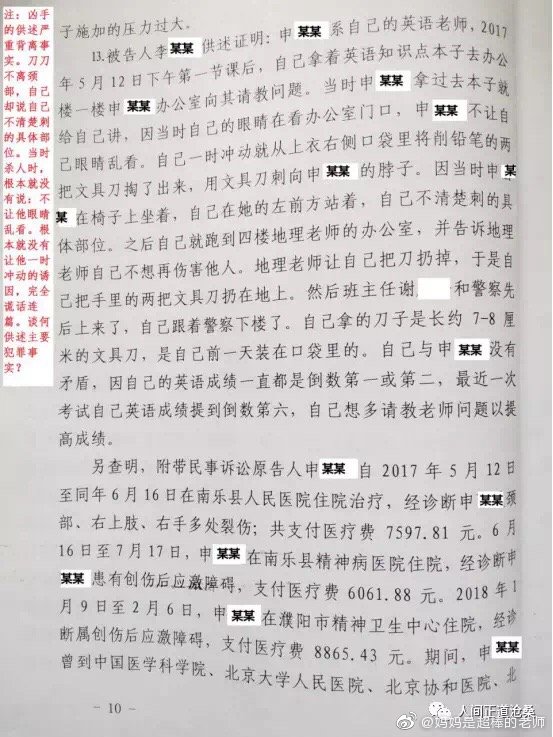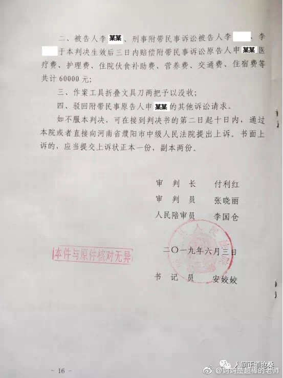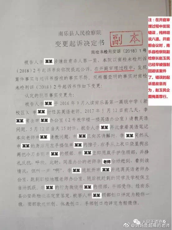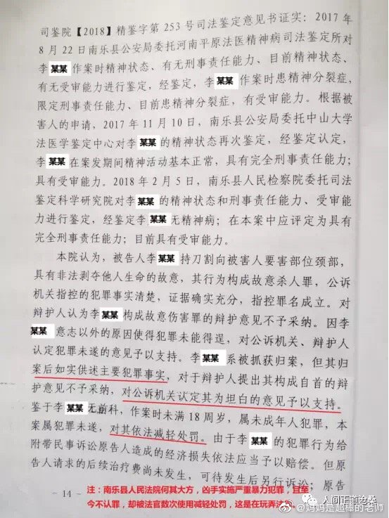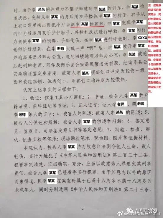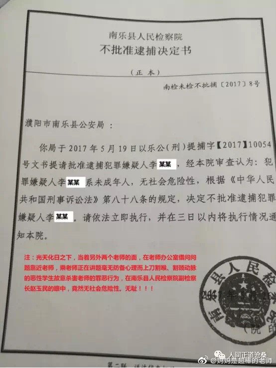 “2017年5月12日下午3時,河南省南樂縣第一高級中學高一26班學生李某,蓄謀已久,借問問題為由,同時使用兩把文具刀對其英語老師實施殘忍的割喉行為,其手段極端殘忍、性質極其惡劣、社會危害性極大,且李某至今不認罪,但南樂縣人民法院無視兇手的主觀惡性、社會危害性、人身危險性,判決極輕。”