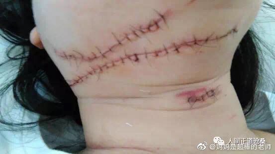 1.兇手在案發前半個月的時間裏,多次借問問題靠近老師,繼而乘老師正在給他講題時毫無防備心理上刀割喉、割頸動脈殺害老師,兇手的弒師行徑天人共誅之。下圖是縫合前、後被割傷的頸部照片: