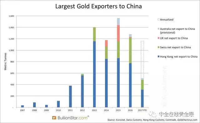 英國在2014年和2015年都向中國出口了大量黃金,但是根據歐盟統計局的數據,今年截至到目前為止,尚未向中國出口黃金。此外,瑞士和澳大利亞今年上半年分別向中國進口了172噸和23噸黃金。