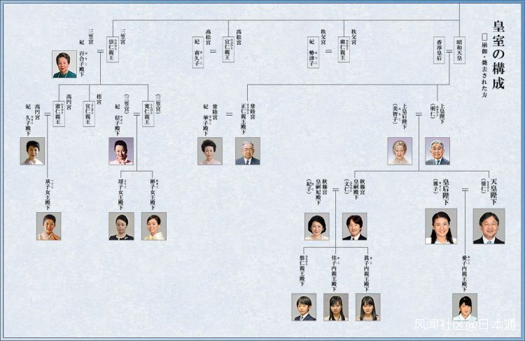 皇室的構成是近代才這麼劃分的。1947年,日本政府制定了用來規範皇室繼承的《皇室典範》,並將其納入法律範疇。《皇室典範》第5條中明確記載着: