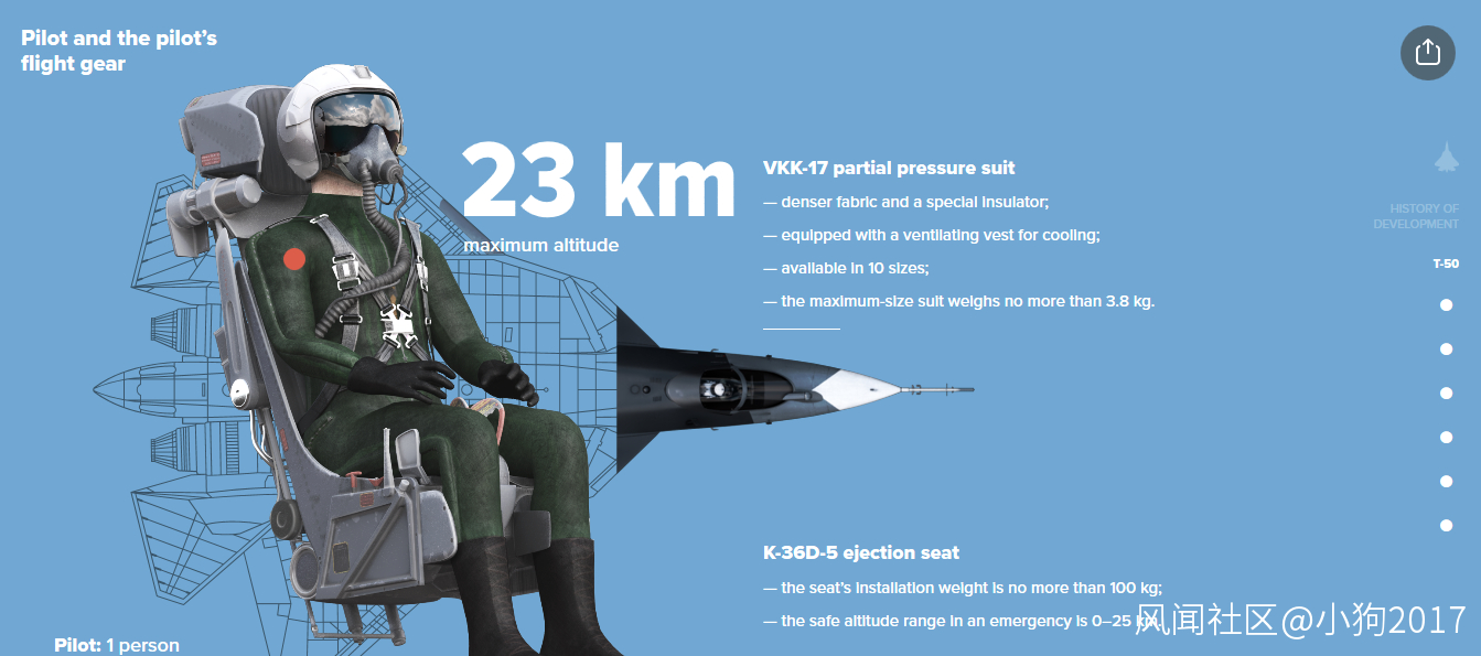 VKK-17分壓服 最大高度:23KM- 更緻密的織物和特殊的絕緣體;-配備通風背心進行冷卻;- 有10種尺寸;- 最大尺寸的衣服重量不超過3.8公斤。K-36D-5彈射座椅- 座椅的安裝重量不超過100公斤;- 緊急情況下的安全高度範圍為0-25公里。