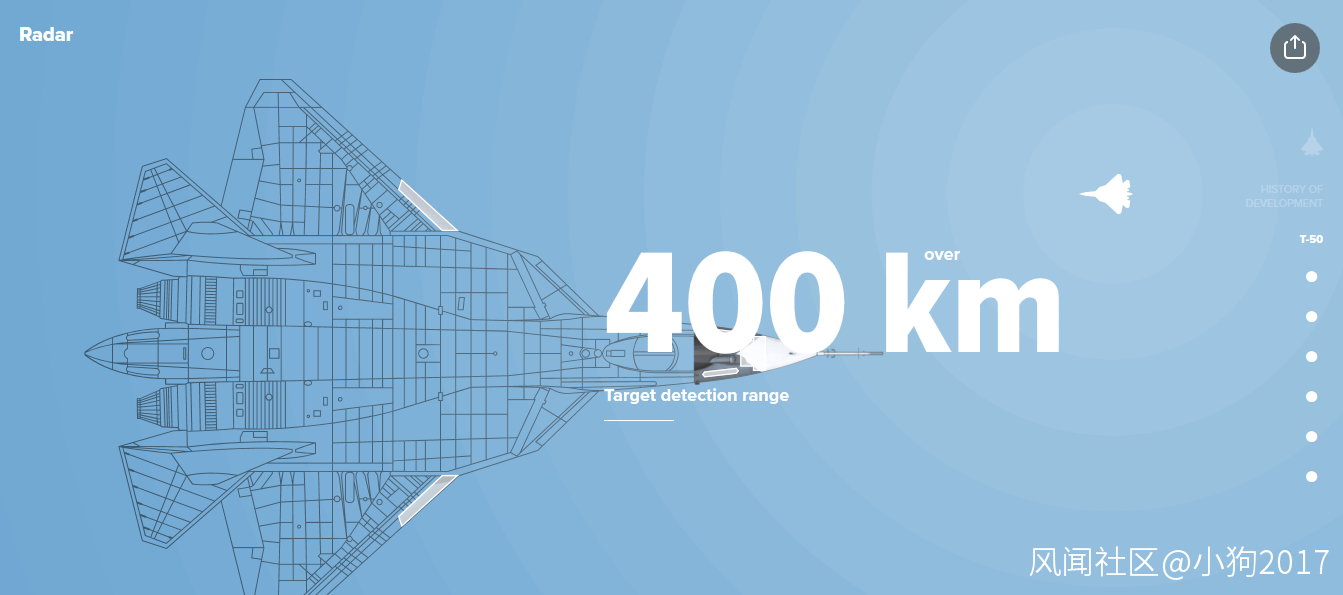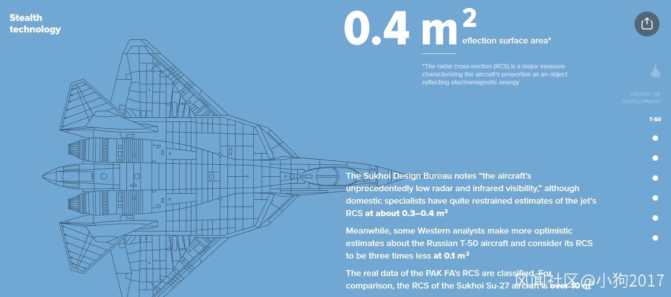 RCS:0.4㎡ *雷達橫截面(RCS)是反映電磁能的物體的主要特徵蘇霍伊設計局提到“飛機空前低的雷達和紅外能見度”,儘管國內專家對這型飛機的RCS的估計相當謹慎,約為0.3-0.4㎡同時,一些西方分析家對俄羅斯T-50型飛機的估計更為樂觀,認為他的RCS在0.1㎡的三分之一以下PAK FA的RCS的實際數據是保密的。作為比較,蘇霍伊蘇-27型飛機的RCS超過了10㎡