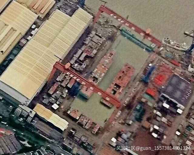 很遺憾目前艦艏的分段尚未搭建,只有艦體的中部完成了部分搭建,所以在圖片裏其艦體長度明顯短於210米長的071綜合登陸艦,但艦體的寬度明顯大於071的28米。因此可以推斷其排水量肯定要大於071的最大排水量29000多噸,應該就是某大佬透露的36000噸。目前其許多分段都堆積在船塢邊上,由此可以推斷其長度將會繼續加長,高度也將增加,外飄也會再增大,説到這裏大家最關心的是國產兩棲攻擊艦應該長啥樣?