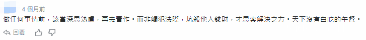 還有人發言教訓詐騙分子:“做任何事情前,該當深思熟慮,再去實作。而非觸犯法際,坑殺他人錢財,才思索解決之方。天下沒有白吃的午餐。”