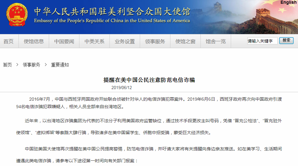 冒充中國大使館詐騙中國公民是台籍詐騙犯常用的撈錢手段之一。就在6月12日,中國駐美國大使館發佈一篇“提醒在美中國公民注意防範電信詐騙”的重要通知,其中不僅提到了西班牙遣返94名台籍電信詐騙犯罪嫌疑人一事,還説台籍詐騙的大肆行騙的手段包括“冒充公檢法”、“冒充駐外使領館”、“虛擬綁架”等套路。