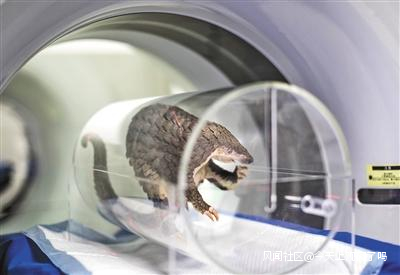 3月底,廣東野生動物救護中心接收了一批由海關查沒的走私穿山甲。圖為一隻被救護的穿山甲在動物醫院做CT檢查。受訪者供圖