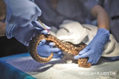 一隻被救護的穿山甲尾巴出現化膿,救護人員在對其進行檢查和治療。受訪者供圖