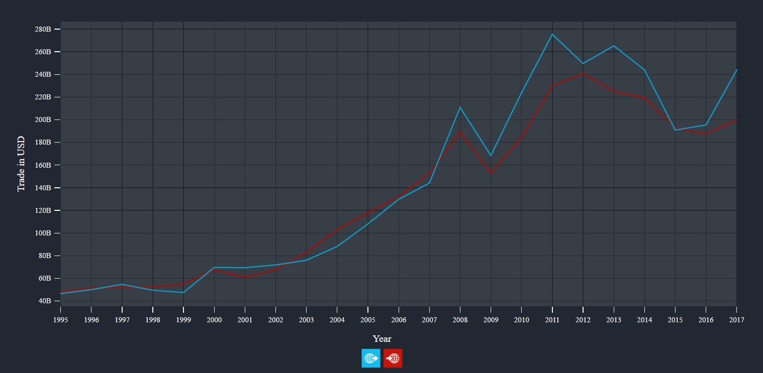 出口對澳大利亞經濟很重要,這是澳大利亞進出口趨勢,藍線是出口,紅線是進口