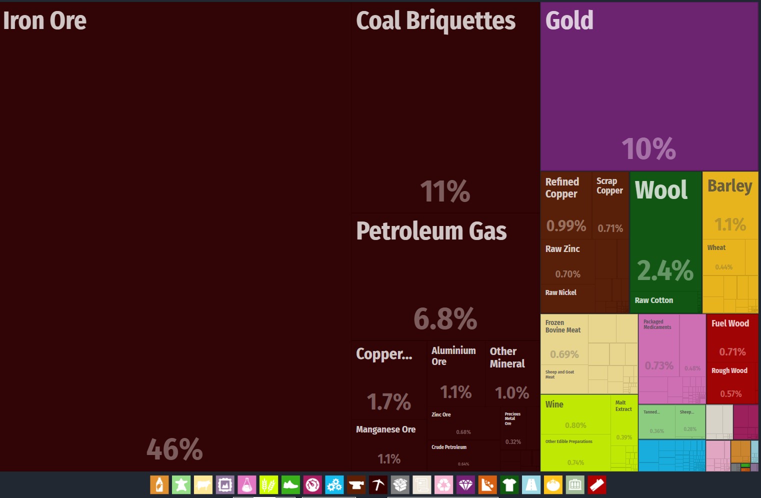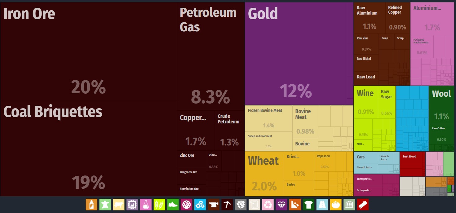 儘管屬於發達國家,但澳大利亞實際上是資源和農產品出口國,工業製成品的出口只佔很小的比例。這是澳大利亞的出口構成