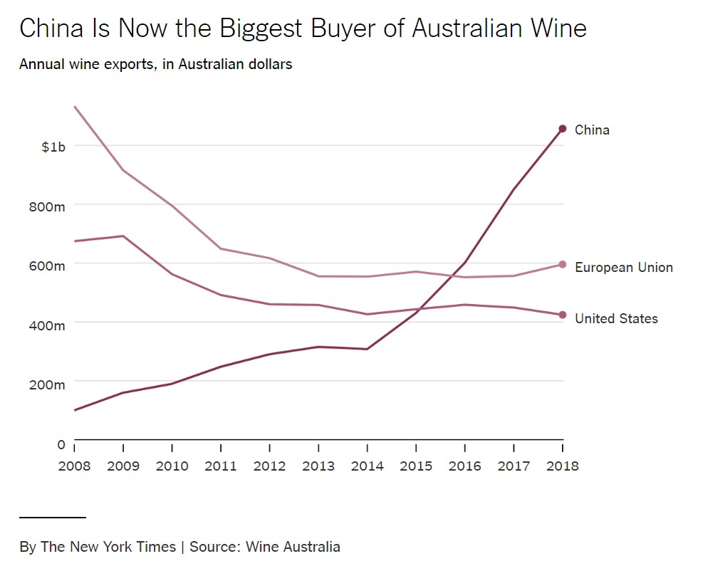 澳大利亞對美、歐、中的酒類出口趨勢,中國的漲勢和歐美的頹勢恰成對照,充分説明了澳大利亞煩惱的由來。腦袋和屁股往兩個方向拉,怎麼能不煩惱?