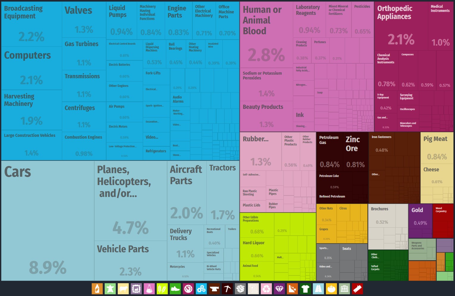 在進口方面,澳大利亞總進口的24%來自中國,總值470億美元,其中9.7%為廣電產品,電腦8.2%。美國第二,佔10%,總值205億美元,其中汽車8.9%,飛機4.7%,有意思的人類和動物血液製品,佔2.8%,高於廣電、電腦、車輛部件、飛機部件,真是血濃於水了。韓國、日本分別為9.3%和8.2%。