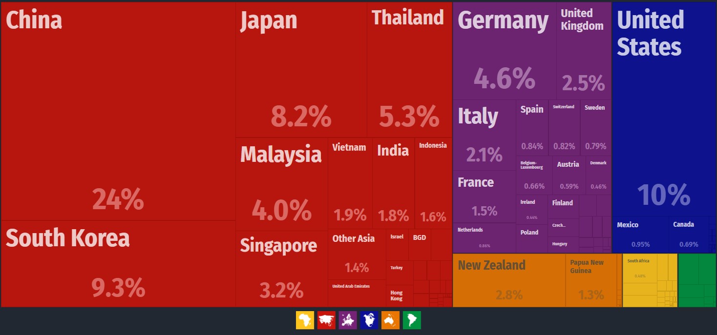 澳大利亞按國家的進口比重,中國穩居第一,達到位居第二的美國的250%