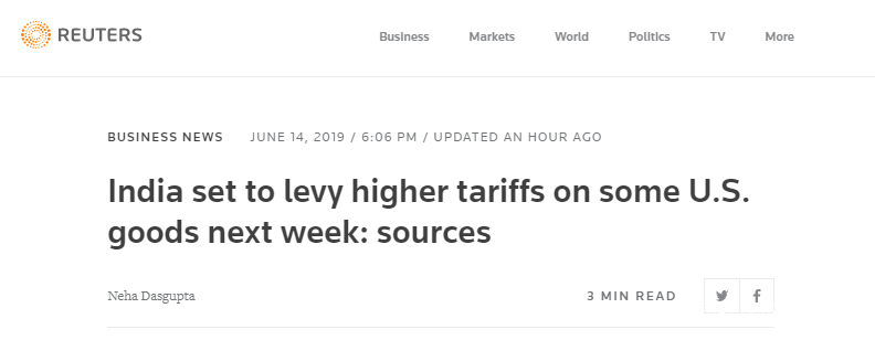 外媒:印度下週擬對美國杏仁、蘋果等部分產品徵收“更高關税”2019-06-14 19:38 環球網 朱夢穎 【環球網報道 記者 朱夢穎】 美國政府終止印度普惠制(GSP)貿易地位的決定於6月5日正式生效。受此影響,價值約56億美元的2900餘種印度輸美商品自即日起無法再享受美方此前提供的關税減免優惠。印媒此前報道稱,印度政府目前正在考慮應對措施。據路透社14日最新消息,兩位知情人士透露,印度下週擬對原產自美國的杏仁、核桃和蘋果等商品徵收更高關税。