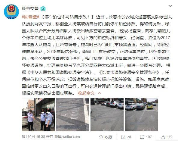 @長春交警 發佈通報,飯店因私自塗改公共停車位,其經理被帶至派出所接受調查。