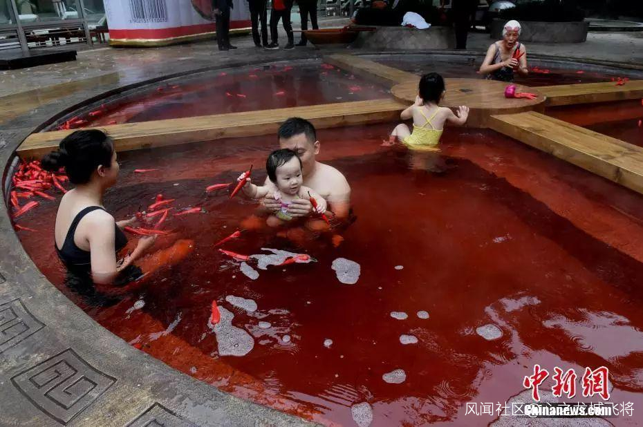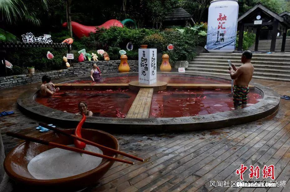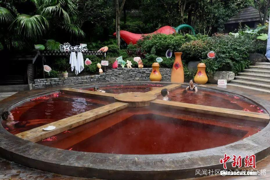 重慶一温泉曾推出過這樣一款“奇妙的紅湯池”,直徑6.7米的圓形湯池被改造成一口4格“鐵鍋”,配上紅色的温泉,如同巨型麻辣火鍋。“火鍋”温泉湯池裏的“火鍋底料”是用雞血藤、艾葉、紅花、首烏等中藥材加上紅酒熬製而成,對人體有一定保健功能。