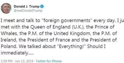 我每天都與“外國政府”會面和交談,我剛剛還會見了英國女王、鯨魚王子、英國首相、愛爾蘭總理、法國總統和波蘭總統。