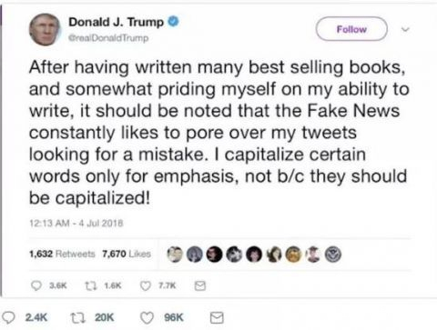 Trump said:“After having written many best selling books, and somewhat priding myself on my ability to write, it should be noted that the Fake News constantly likes to pour over my tweets looking for a mistake。 I capitalize certain words only for emphasis, not b/c they should be capitalized!”