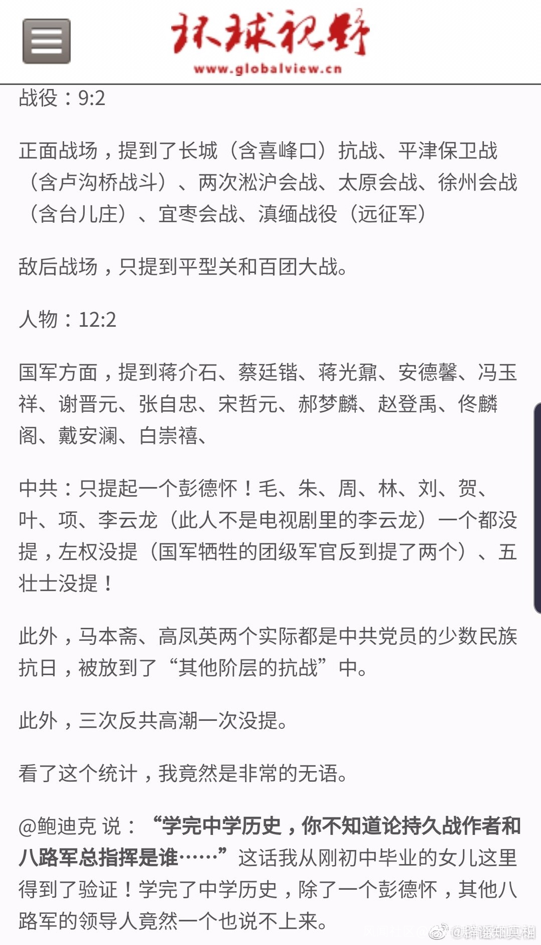 網友@鮑迪克 説:“學完大陸中學歷史,你不知道論持久戰作者和八路軍總指揮是誰……”這話從一位初中畢業的孩子那裏得到了驗證:學了這段歷史,除了一個彭德懷,其他八路軍的領導人竟然一個也説不上來。